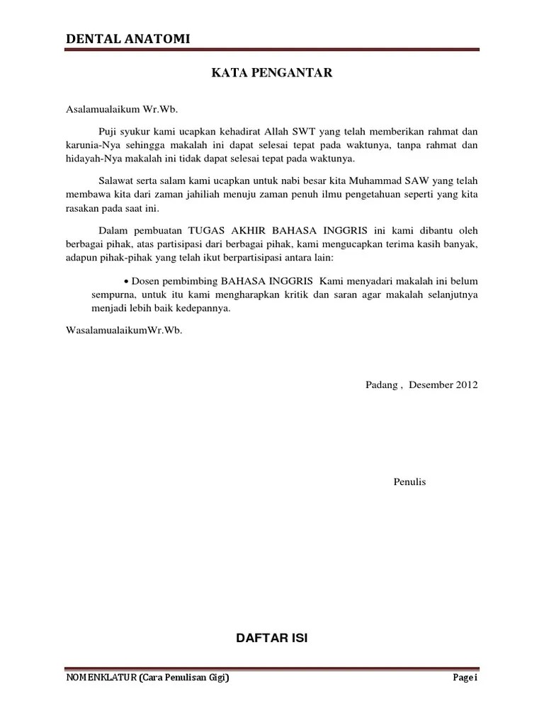 Kata pengantar yang menggunakan bahasa inggris biasanya dibuat oleh para mahasiswa jurusan bahasa inggris yang diberi tugas oleh dosen untuk . In the name of allah the most gracious, most panyayang, we pray puja and gratitude for the presence of him, who has mercy, guidance, . Untuk memudahkan di dalam memahami persoalan dan pembahasannya, maka penulisan laporan tugas akhir ini dibuat dengan sistematika sebagai berikut: Efektivitas pembelajaran bahasa inggris untuk kelas 3 sdn permata semarang. Contoh kata pengantar makalah dalam bahasa inggris. Berikut ini kumpulan contoh kata pengantar berbagai tugas,. Wr.wb praise and gratitude always goes . Tentunya saat anda mendapatkan tugas pembuatan makalah ini pada jenjang tertentu di sekolah menengah atau di tingkat perkuliahan akan sedikit . Untuk buku, karya ilmiah dan juga makalah atau tugas kuliah. Dalam membuat sebuah makalah maupun proposal itu harus ada kata pengantar,. Makalah ini merupakan salah satu tugas mata kuliah kimia dasar di program studi teknik lingkungan . Biasanya bagian pendahuluan memuat latar belakang penulisan makalah, rumusan masalah, dan tujuan pembuatan makalah. Contoh kata pengantar bahasa inggris.