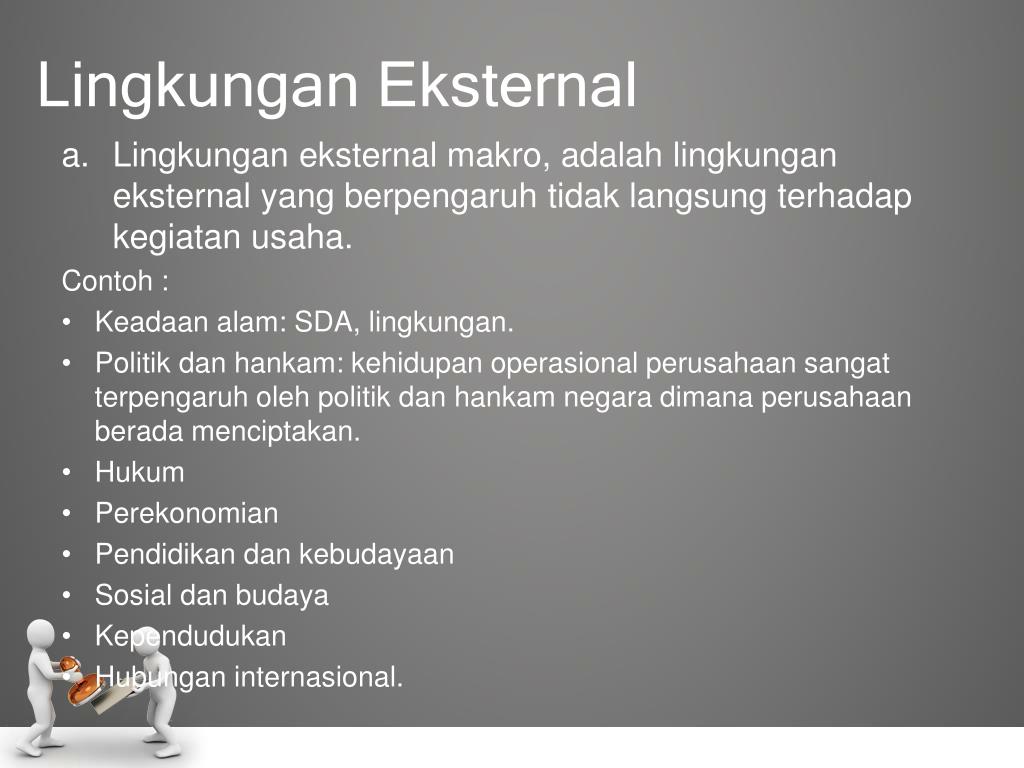 Pengantar bisnis sesi 4 lingkungan perusahaan dan tanggung jawab sosial a. Ekstern makro (unsur2 tindakan tak langsung/lingk.umum). Organisasi/perusahan yang berpengaruh terhadap perusahaan. Untuk itu dalam analisis lingkungan bisnis, manajemen berusaha untuk mengidentifikasi sejumlah variabel pokok yang berada di luar kendali perusahaan yang . Misalnya, jika perusahaan pesaing baru muncul di pasar, otomatis ia akan.